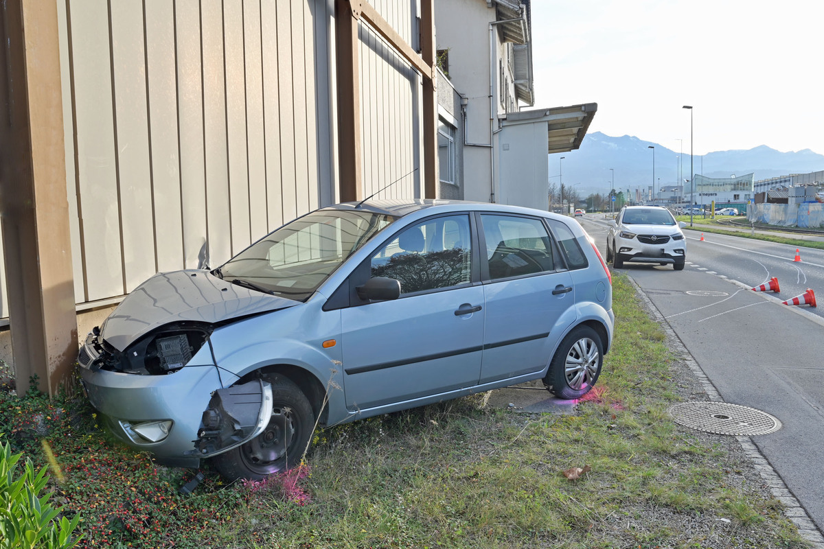 Durch die Kollision kam der Autofahrer mit seinem Fahrzeug rechtsseitig von der Strasse ab, fuhr über das Trottoir sowie eine Grünfläche und prallte letztlich frontal gegen ein Gebäude.